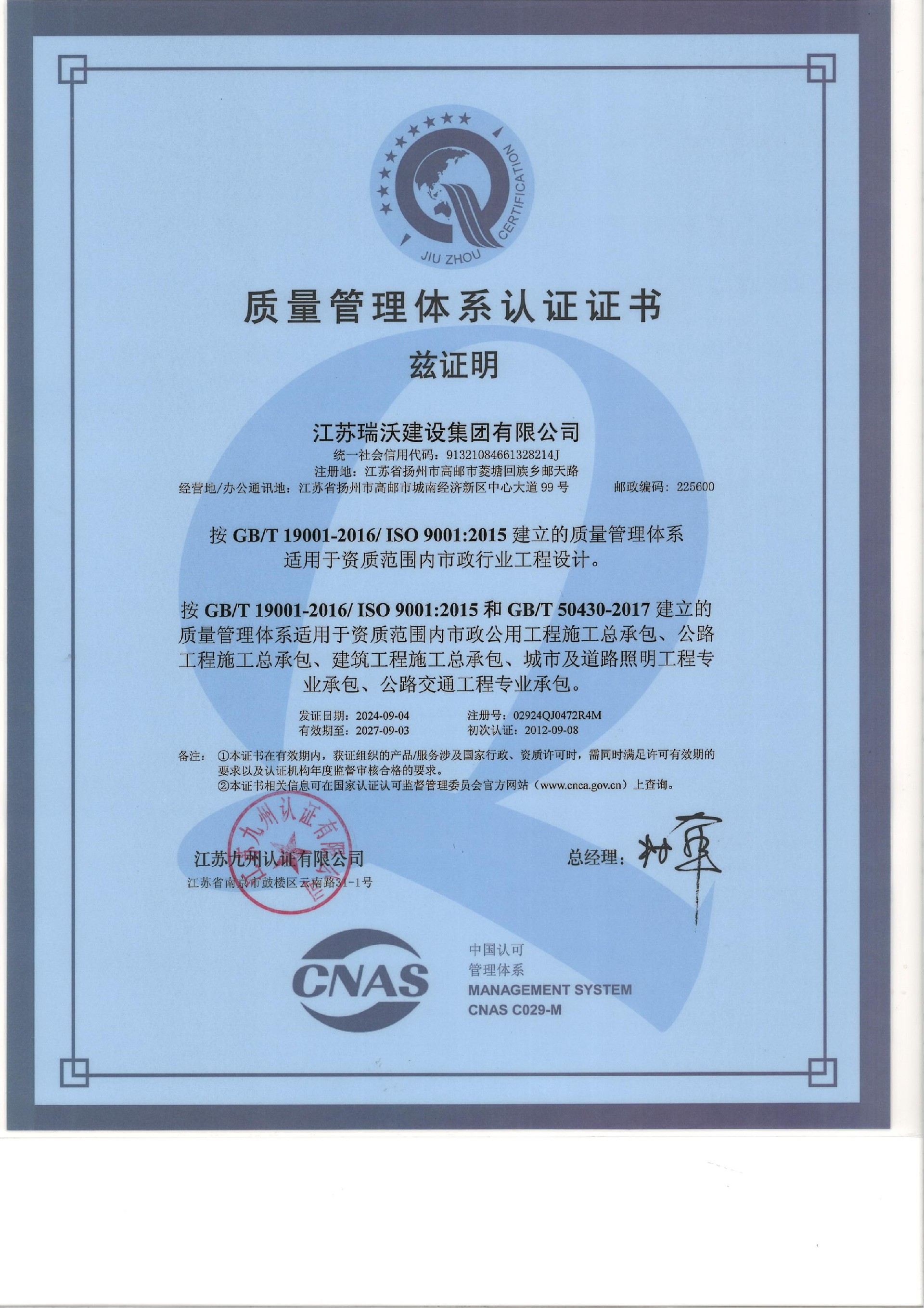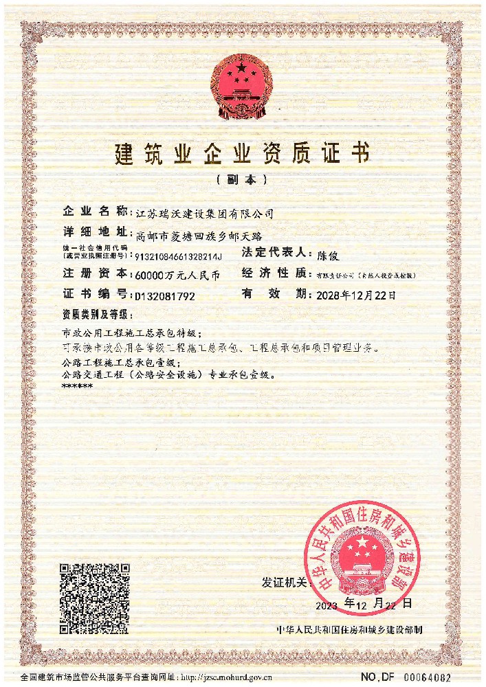 江蘇瑞沃建設(shè)集團有限公司成立于2007年,是一家以市政、交通工程建設(shè)為主導(dǎo),集房屋建筑、交通安全設(shè)施、城市道路照明工程、電力工程、隧道工程、航道工程及投融資為一體的綜合性企業(yè)。企業(yè)注冊資本60000萬元,現(xiàn)有各類技術(shù)人員580人,其中中、高級以上人員498人,注冊類人員268人,一、二級建造師166人。公司榮獲“江蘇省建筑業(yè)優(yōu)秀企業(yè)”、“江蘇省五一勞動獎狀”,連續(xù)多年被評為“揚州市先進企業(yè)”、“江蘇省建筑業(yè)百強企業(yè)”,連續(xù)八年蟬聯(lián)百強企業(yè)基礎(chǔ)設(shè)施類第一名。